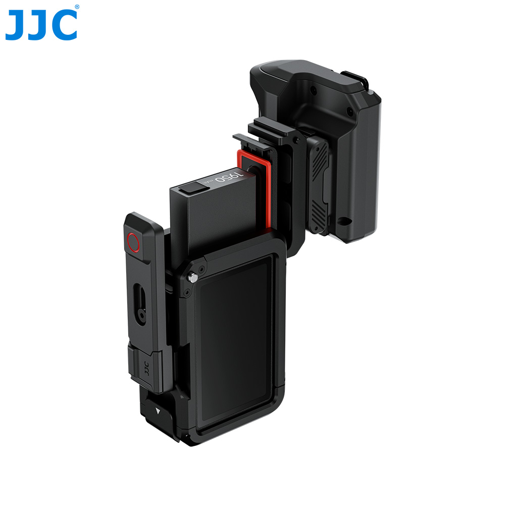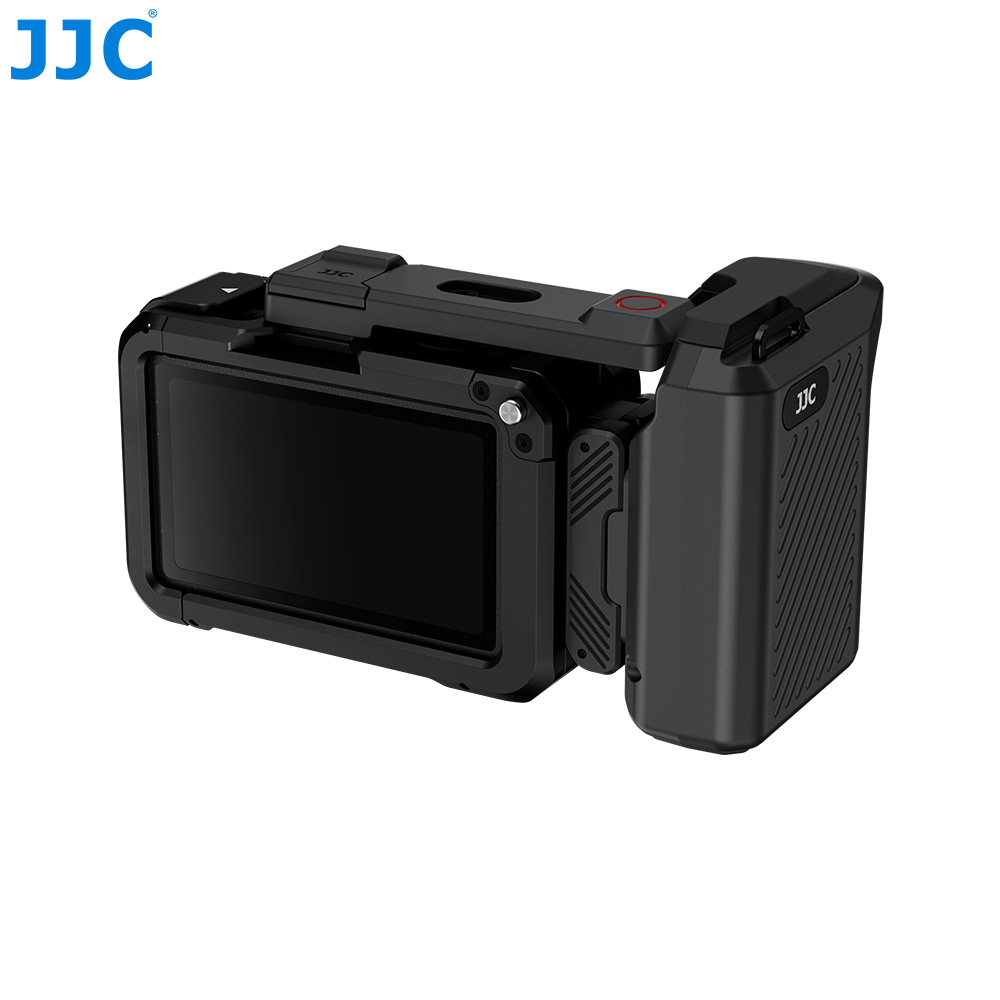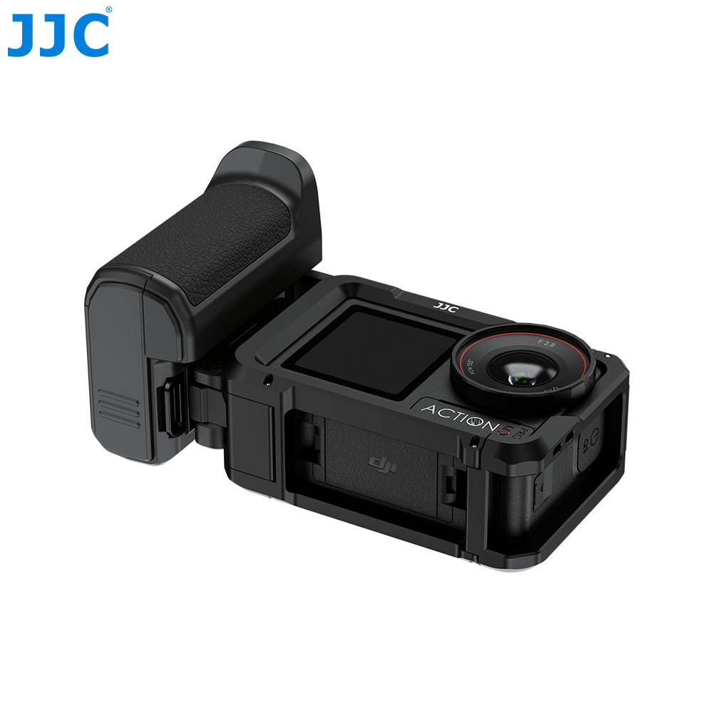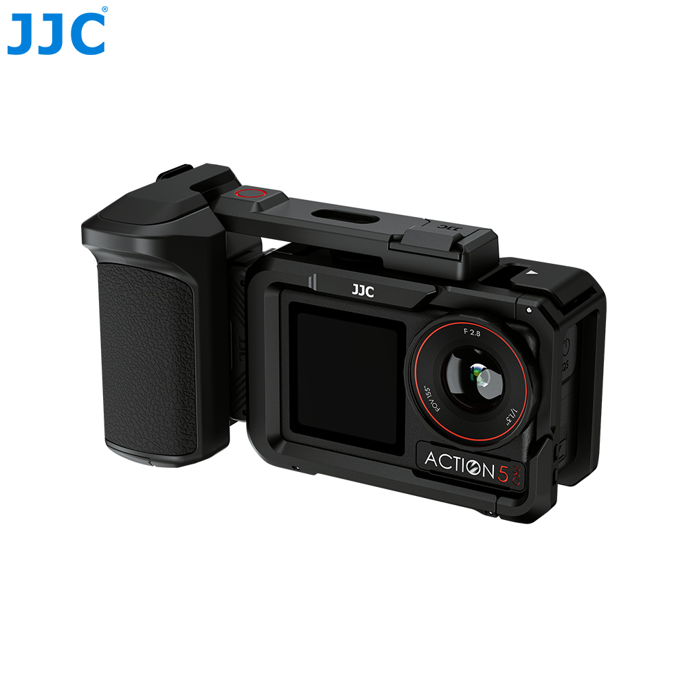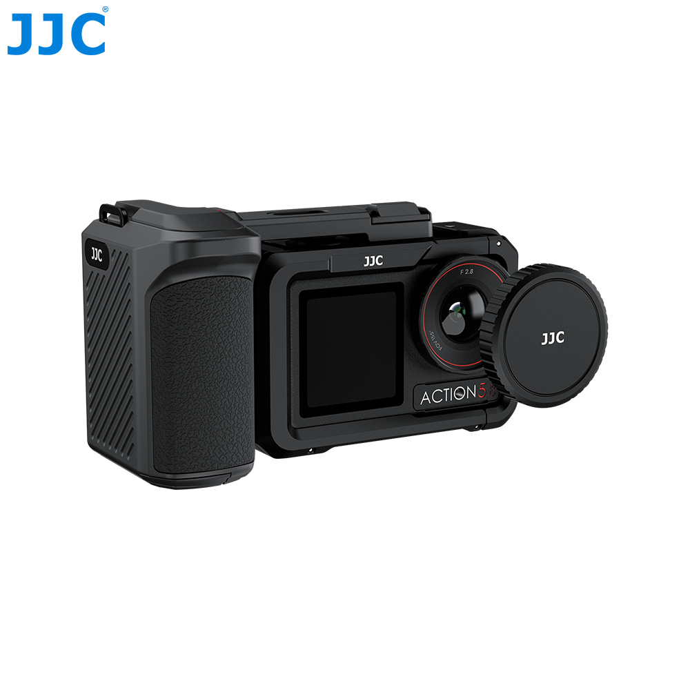 For DJ. Osmo Action 5 Pro / 4 / 3;Lightweight and durable aluminum alloy cage with precise fit;Soft anti-slip silicone pads to prevent scratches;Can Store one battery and one microSD card;Lanyard hole compatible with JJC wrist strap (sold separately);ABS and silicone handle with ergonomic design, lightweight and comfortable;Cold shoe mount on the lever for accessory expansion;Shutter adapter button for smoother shooting control;Adjustable shutter adapter button contact point for different models;No interference with buttons, touchscreen, or ports;Battery door and microSD slot remain fully accessible;Daily operation without frequent disassembly;Includes lens cap, hot-shoe cover, anti-loss cord, and wrist straps