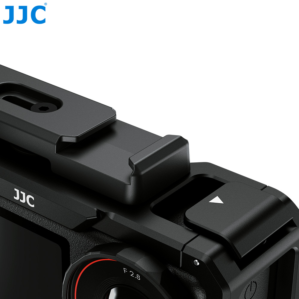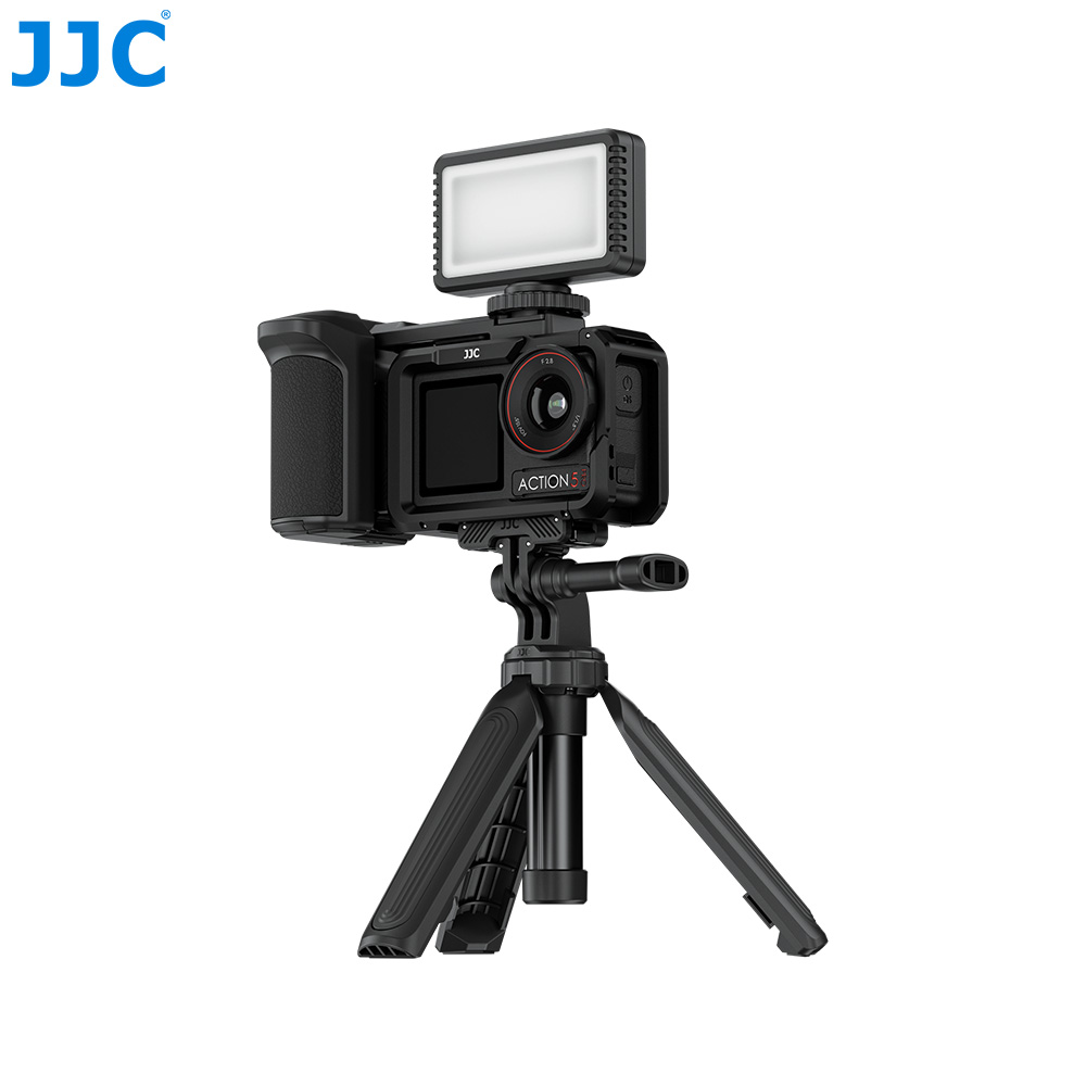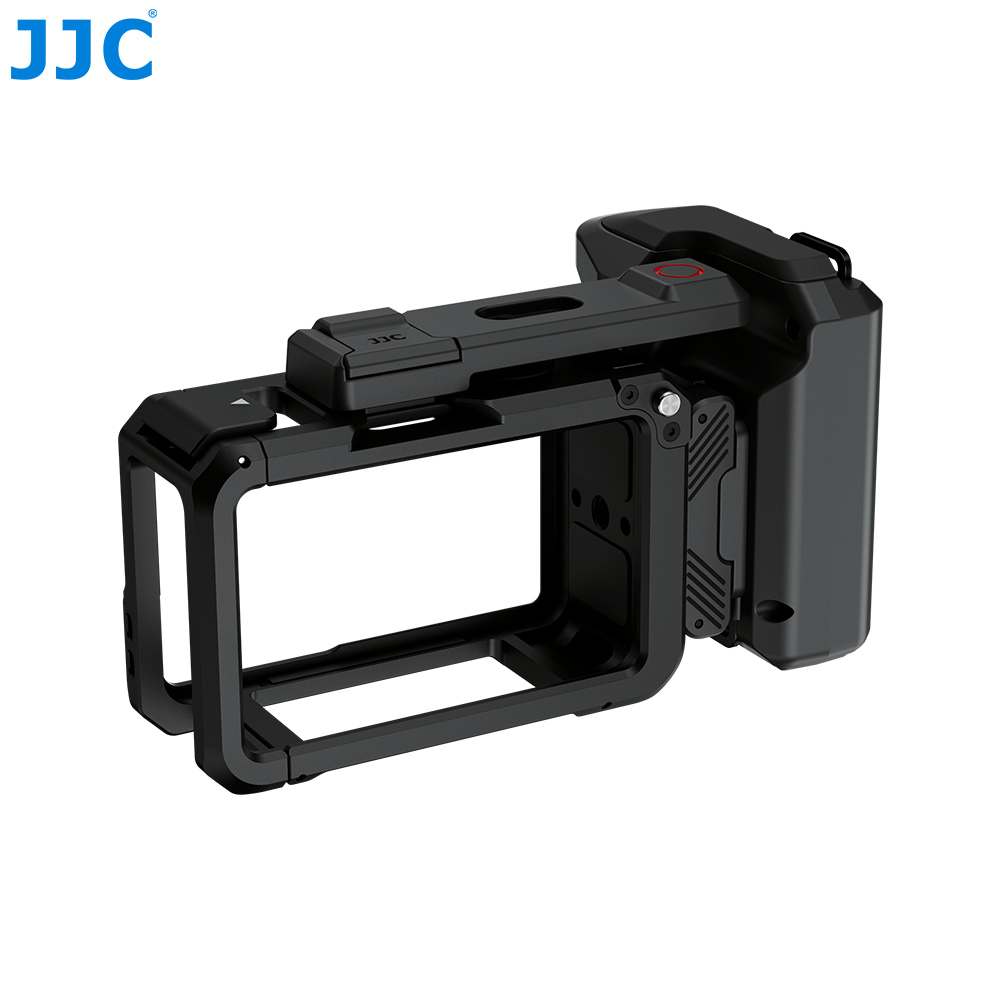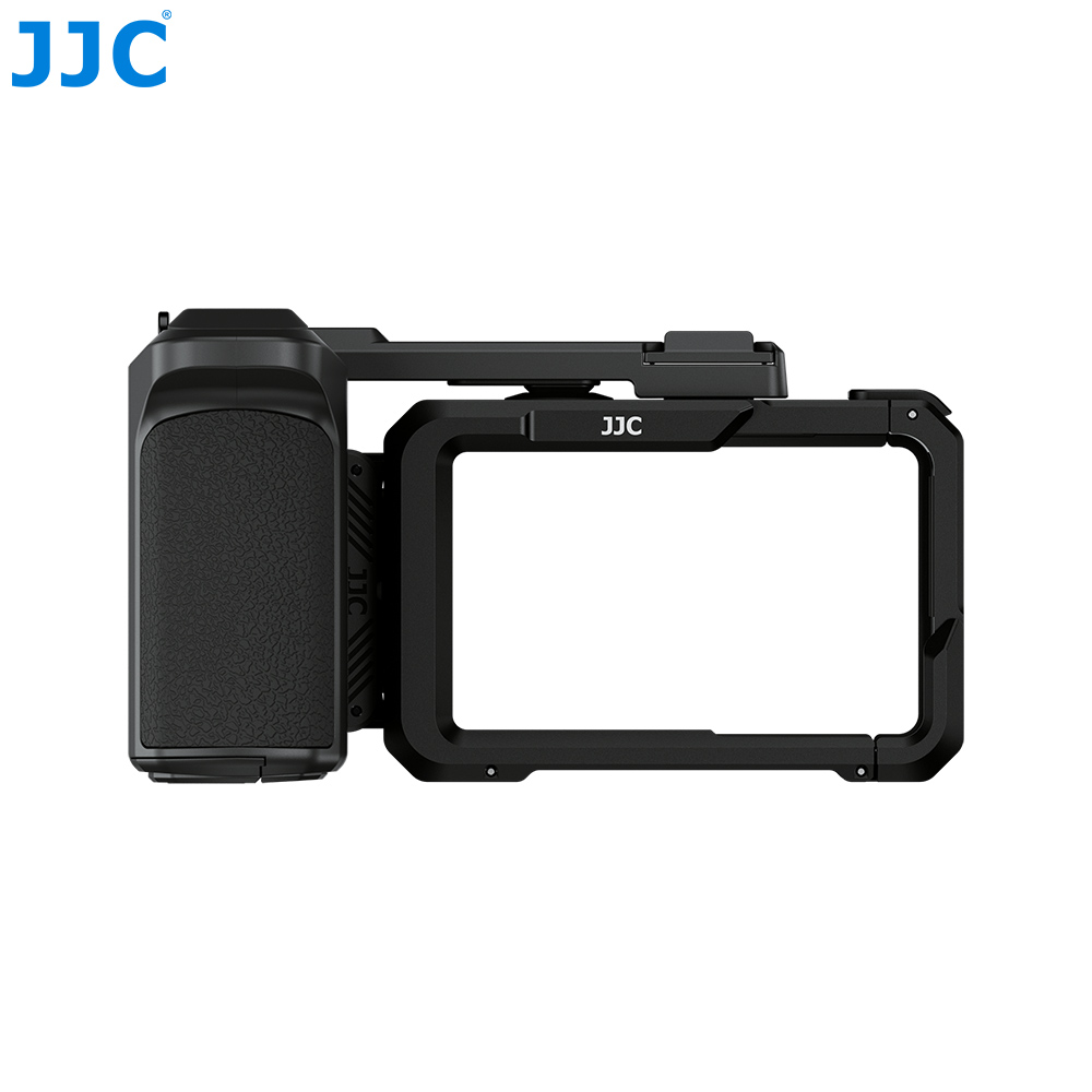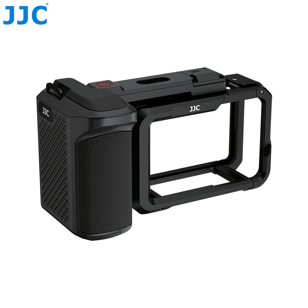 For DJ. Osmo Action 5 Pro / 4 / 3;Lightweight and durable aluminum alloy cage with precise fit;Soft anti-slip silicone pads to prevent scratches;Can Store one battery and one microSD card;Lanyard hole compatible with JJC wrist strap (sold separately);ABS and silicone handle with ergonomic design, lightweight and comfortable;Cold shoe mount on the lever for accessory expansion;Shutter adapter button for smoother shooting control;Adjustable shutter adapter button contact point for different models;No interference with buttons, touchscreen, or ports;Battery door and microSD slot remain fully accessible;Daily operation without frequent disassembly;Includes lens cap, hot-shoe cover, anti-loss cord, and wrist straps