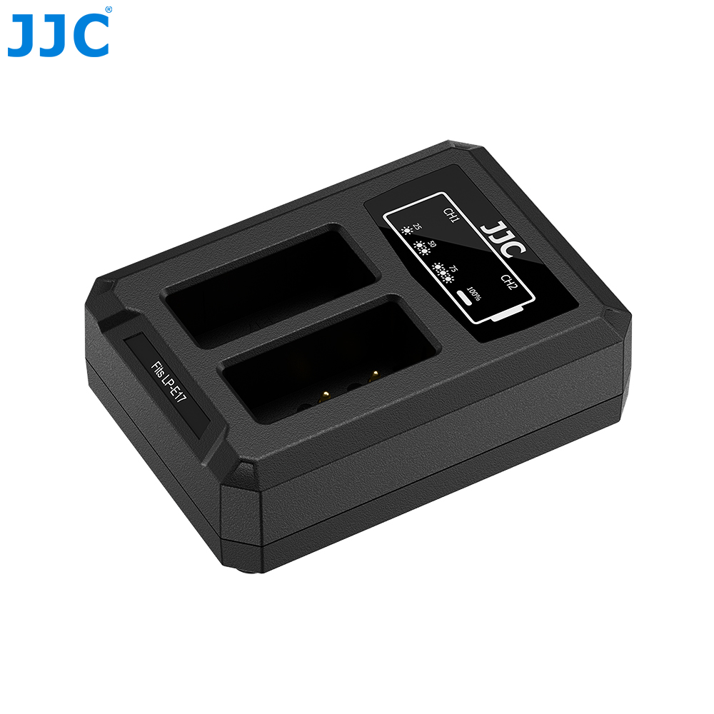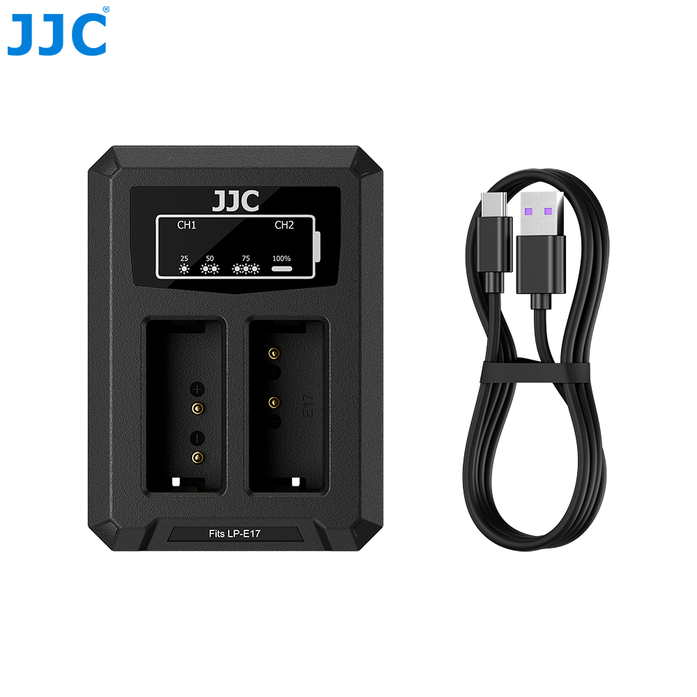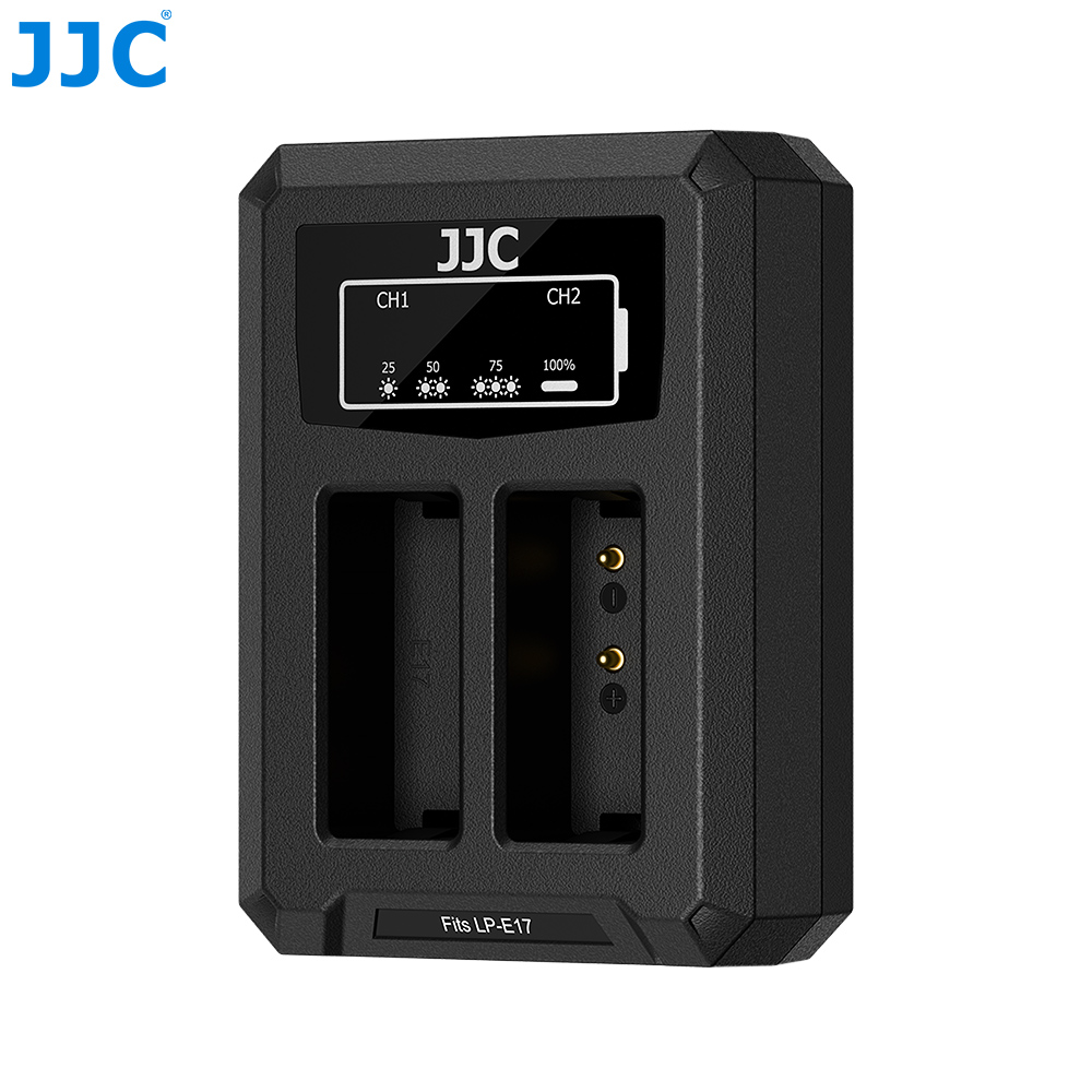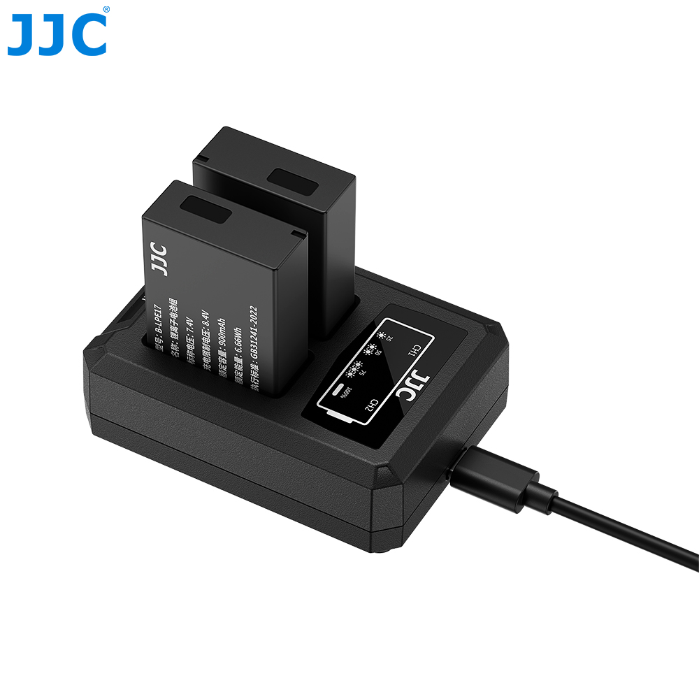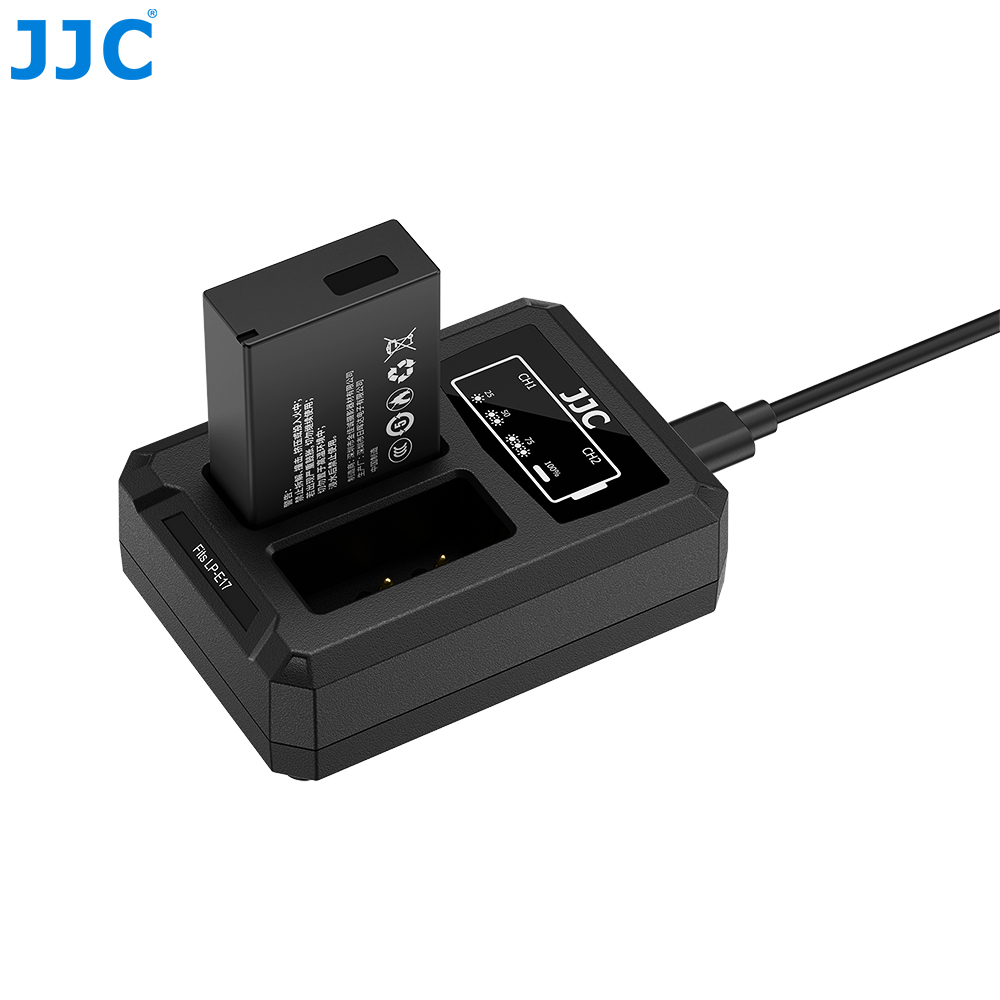 JJC DCH TC series USB Dual Battery Charger allows you to charge 2 batteries at the same time.This battery charger features a universal Type-C (USB-C) port with enhanced compatibility, allowing connection to various power sources. You can charge the device using an AC adapter, laptop, power bank, or car charger, ensuring convenient power supply anytime, anywhere. The charger is equipped with two indicator lights to show the charging status of each slot: flashing while charging and steady on when fully charged. With an overcharge protection design, the charger automatically stops charging once the batteries are fully charged, preventing damage. In addition, a Type-C to USB-A charging cable is included for powering the charger.