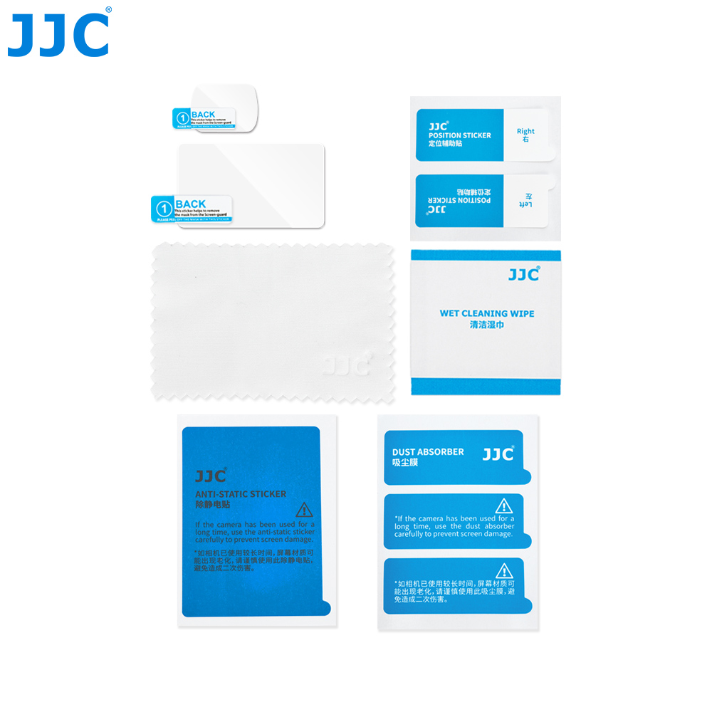The package includes a wet cleaning wipe and a microfiber cloth for easy cleaning. Additionally, depending on your camera model, you get a pair of PET guard films for the camera sub-screen.