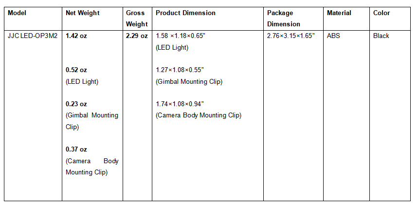 Specially designed for the DJ. Osmo Pocket 3;Magnetic design for quick attachment;Includes two mounting clips that fit the gimbal and camera body, offering three magnetic mounting points Does not interfere with gimbal or screen rotation;Built-in 15 high-quality LEDs deliver soft, even lighting to enhance image quality;Three lighting modes (White / Warm / Warm White) for various shooting scenarios;Three adjustable color temperatures (3000K±200K/4500K ± 200K/6500K ± 200K) for flexible ambiance control;High CRI of 95+ for accurate color reproduction;Dual-button operation: Power button for on/off and color temperature, M button for cycling through three brightness levels;Built-in 200mAh battery with USB charging support;Compact design with included drawstring pouch for easy outdoor carrying
