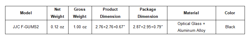Model In the box Product image JJC F-GUMS2 1/2 Black Mist Filter ×1 Filter Case ×1 Microfiber Cleaning Cloth ×1
