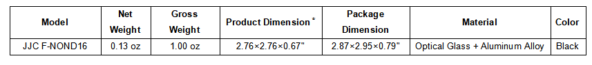 JJC F-NOND16 | ND16 Filter ×1 Microfiber Cleaning Cloth ×1 Filter Case ×1 |