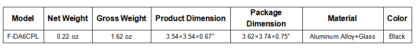 Model In the box Product image JJC F-DA6CPL CPL Filter ×1 Filter Case ×1 Microfiber Cleaning Cloth ×1