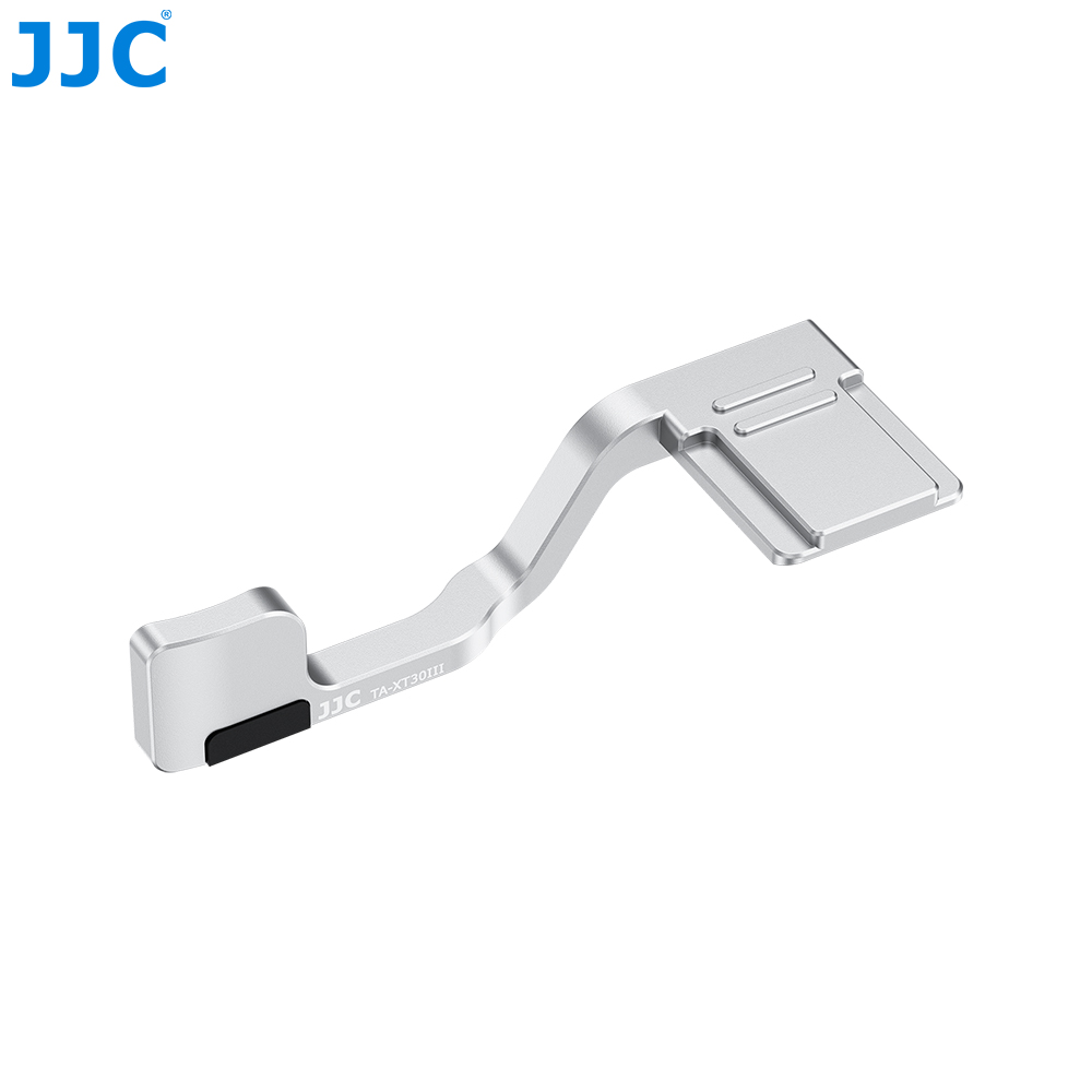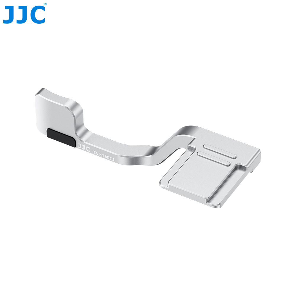 JJC TA-XT30III Series Thumbs Up Grip is compatible with FUJI. X-T30 III, X-T30 II, X-T30, X-T20, and X-T10. It is designed to enhance the comfort and stability of your camera grip. Made of premium aluminum alloy, this grip is sturdy and durable. Its ergonomic shape provides thumb support at the rear of the camera, ensuring a more secure hold during shooting. The bottom silicone pad protects the camera’s hot shoe contacts, prevents dust and moisture, and ensures a secure fit. The thumb rest is covered with a silicone surface for enhanced grip and comfort, providing stable handling even during extended use. Additional silicone padding on the side that touches the camera further protects against scratches. Attaching the grip is quick and easy. Simply slide the grip into the camera’s hot shoe to attach and slide it out to remove. The grip is available in black and silver, offering options to match your camera style.