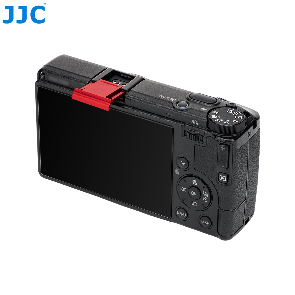 This hot shoe cover is available in black, red, dark gray, purple, and blue, allowing for versatile color coordination. In addition, it can be paired with the JJC RN-GR4 lens decorative ring.