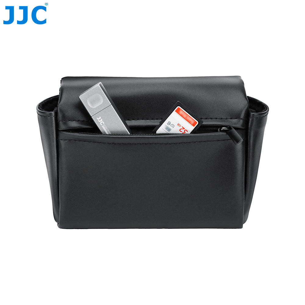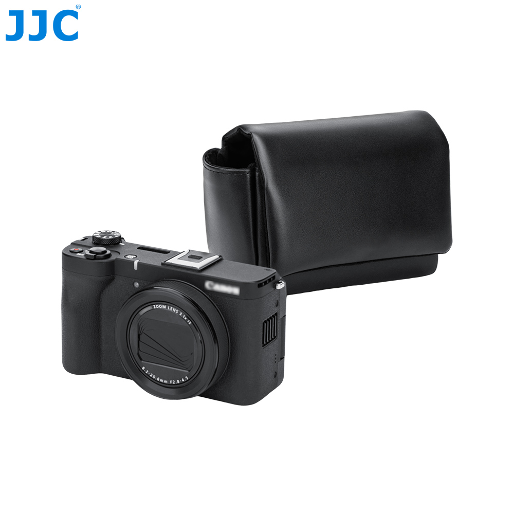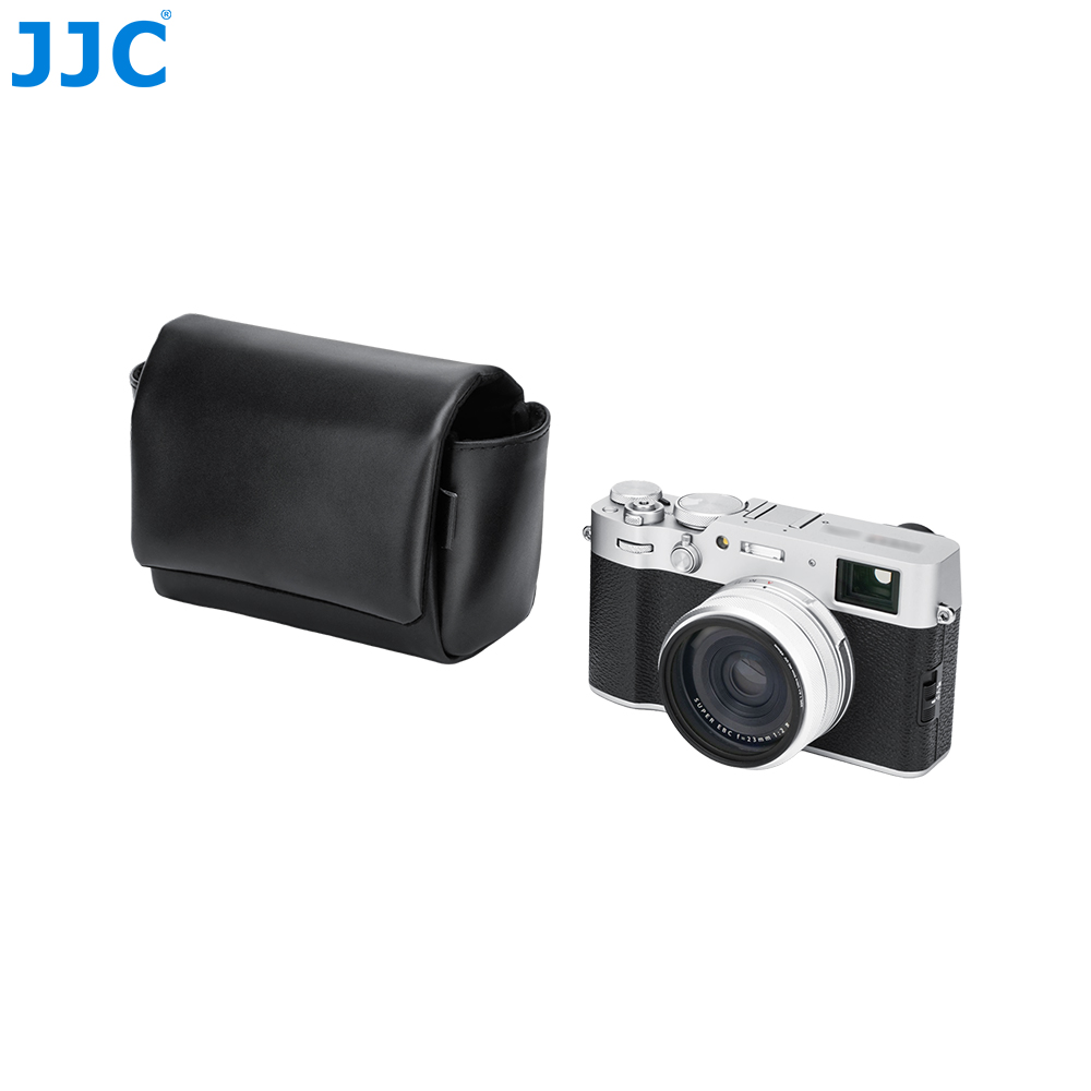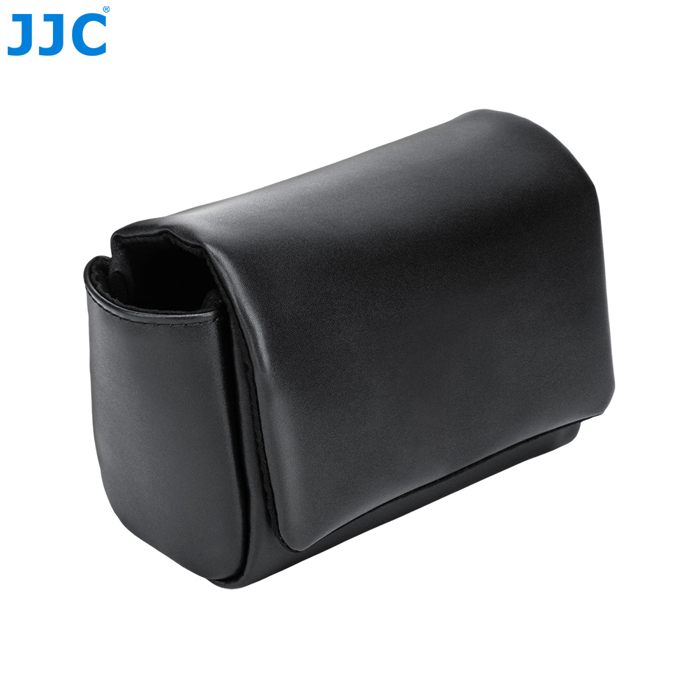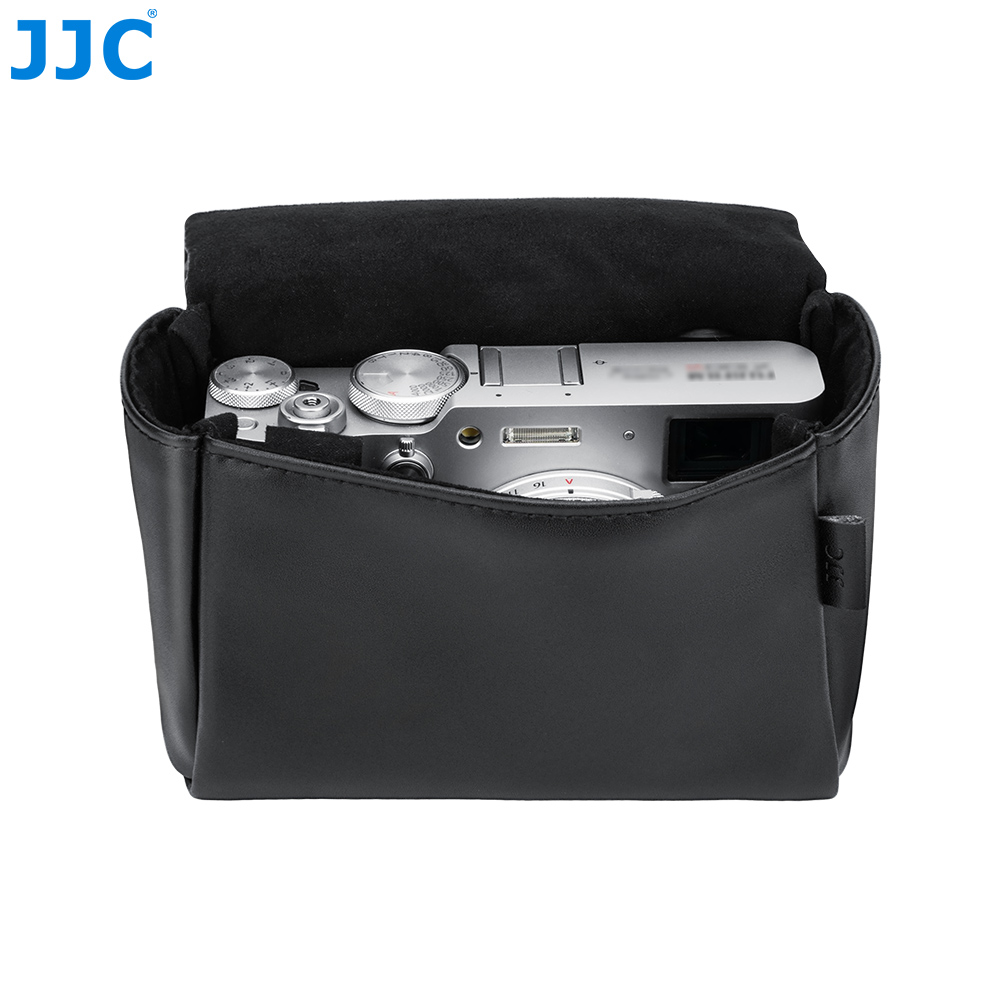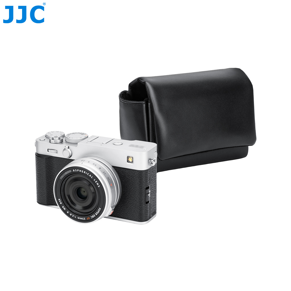 JJC CL-M Series Camera Pouch is designed for FUJI. X100VI, X100V, and FUJI. X-E5 ( paired with FUJI. XF 23mm F2.8 R WR,XF 27mm F2.8 R WR or XF 27mm F2.8 lens), as well as the CAN. PowerShot V1 and other compatible cameras. It securely stores and protects your camera from dust, bumps, scratches, and minor impacts. The magnetic closure design allows for quicker and more efficient access to your camera. The exterior is crafted from premium microfiber leather, offering a refined texture with excellent durability and wear resistance, making it ideal for everyday use. The interior features a soft faux suede lining that helps prevent scratches and protects both the camera body and lens. The pouch includes a dedicated battery pocket for convenient storage, while a hidden rear pocket provides space for memory cards, card readers, and cleaning cloths. This camera pouch is compatible with camera shoulder straps and does not interfere with strap use. Available in black and blue, the CL-M series offers stylish options to suit your personal preference.