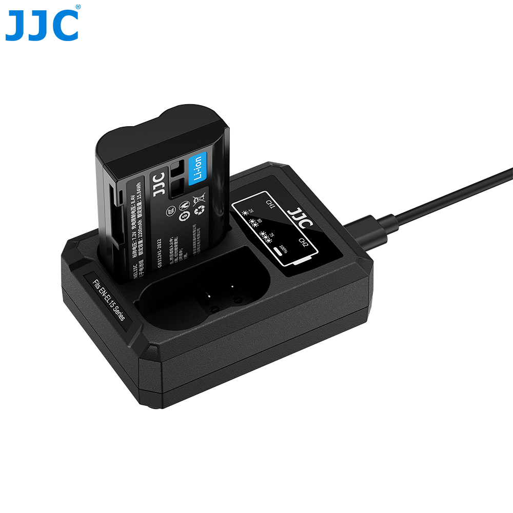JJC DCH TC series USB Dual Battery Charger allows you to charge 2 batteries at the same time.This battery charger features a universal Type-C (USB-C) port with enhanced compatibility, allowing connection to various power sources. You can charge the device using an AC adapter, laptop, power bank, or car charger, ensuring convenient power supply anytime, anywhere. The charger is equipped with two indicator lights to show the charging status of each slot: flashing while charging and steady on when fully charged. With an overcharge protection design, the charger automatically stops charging once the batteries are fully charged, preventing damage. In addition, a Type-C to USB-A charging cable is included for powering the charger.