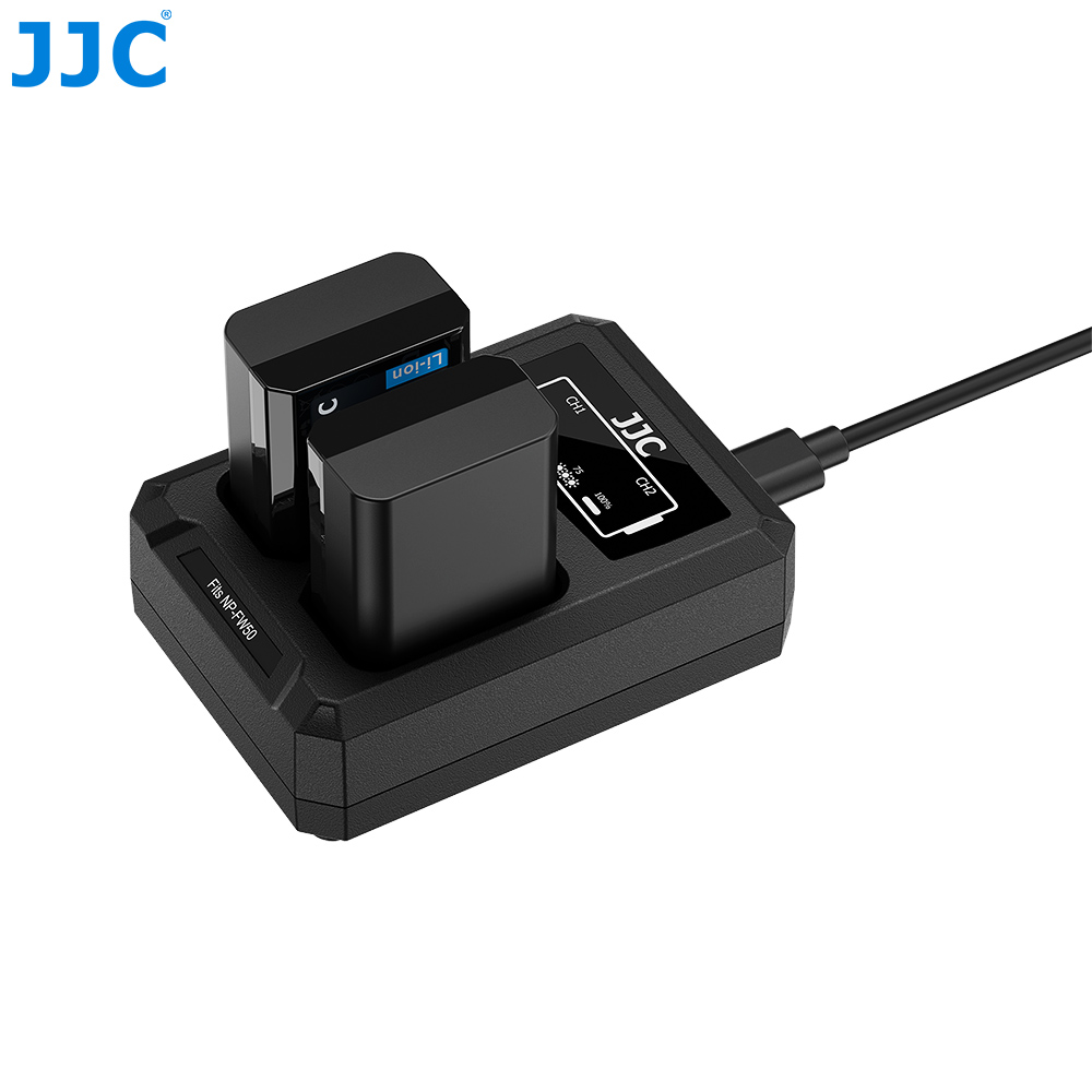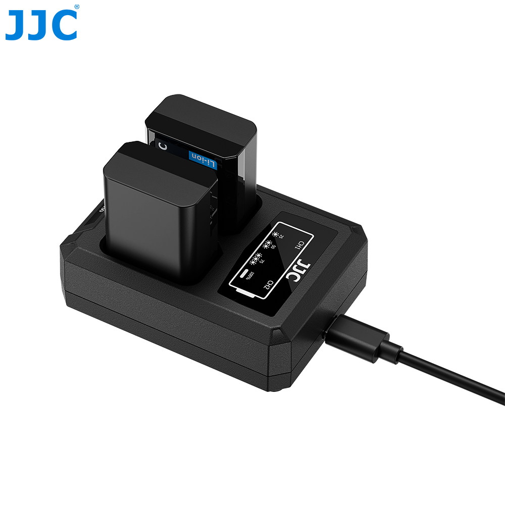 JJC DCH TC series USB Dual Battery Charger allows you to charge 2 batteries at the same time.This battery charger features a universal Type-C (USB-C) port with enhanced compatibility, allowing connection to various power sources. You can charge the device using an AC adapter, laptop, power bank, or car charger, ensuring convenient power supply anytime, anywhere. The charger is equipped with two indicator lights to show the charging status of each slot: flashing while charging and steady on when fully charged. With an overcharge protection design, the charger automatically stops charging once the batteries are fully charged, preventing damage. In addition, a Type-C to USB-A charging cable is included for powering the charger.
