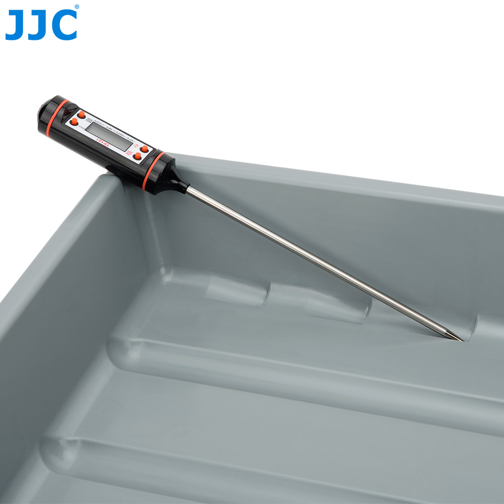 JJC DT-1012 Series Developing Tray is designed for processing photographic prints and film. Made of high-quality polypropylene (PP), it offers excellent heat resistance and a certain degree of acid and alkali resistance. This tray is an essential accessory in the film developing process. The inner surface of the developing tray is smooth and refined to prevent scratching the film or photographic paper, ensuring image quality. The grooved bottom design allows users to easily lift out the paper. A dedicated thermometer slot is integrated into the base of the tray, enabling secure placement of a thermometer for real-time temperature monitoring, which ensures stable and reliable development results. JJC DT-1012 Series Developing Tray comes with a silicone tong, which allows users to handle photographic paper or film without direct contact with chemicals and enhances safety during operation. The bottom is equipped with four silicone pads to improve stability and prevent slipping or tipping in the process of use.
