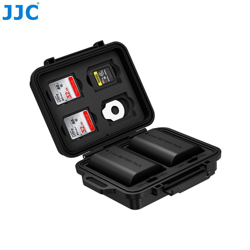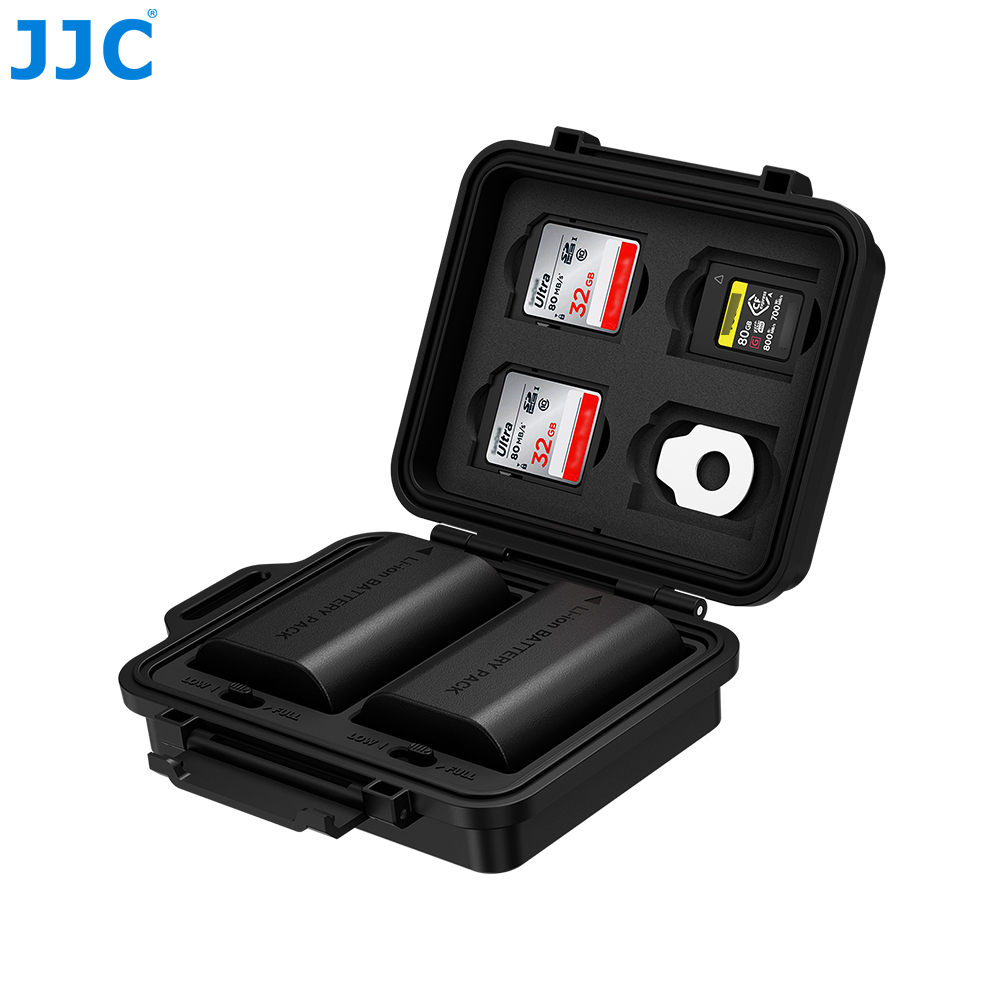 JJC JBC-K2CAS Multi-Function Battery & Memory Card Case can store up to 4 SD cards, 3 CFexpress Type-A cards, 1 flathead tool, and 2 camera batteries (≤56.7 × 39.5 × 23 mm). The case is made of premium ABS material, which is sturdy, durable, and resistant to shock, dust, and abrasion. The ergonomic locking system is secure, reliable, and easy to open and close. The interior features EVA lining and TPR cushions to provide stable shockproof protection for batteries. The battery slots are compatible with CAN. LP-E6, SON. NP-FZ100, FUJI. NP-W235, NIK. EN-EL15, PAN. DMW-BLF19, and OLY. BLX-1, meeting the needs of different camera users. Each battery slot comes with a status slider, making it easy to record and check battery conditions quickly. The exclusive slot design ensures one item per slot, preventing extrusion or collision for enhanced protection. The case comes with a mini knotted short strap and a flathead tool for safer carrying and easier use. In addition, the product is IP67 certified, offering excellent dustproof and waterproof performance for greater peace of mind in daily use.