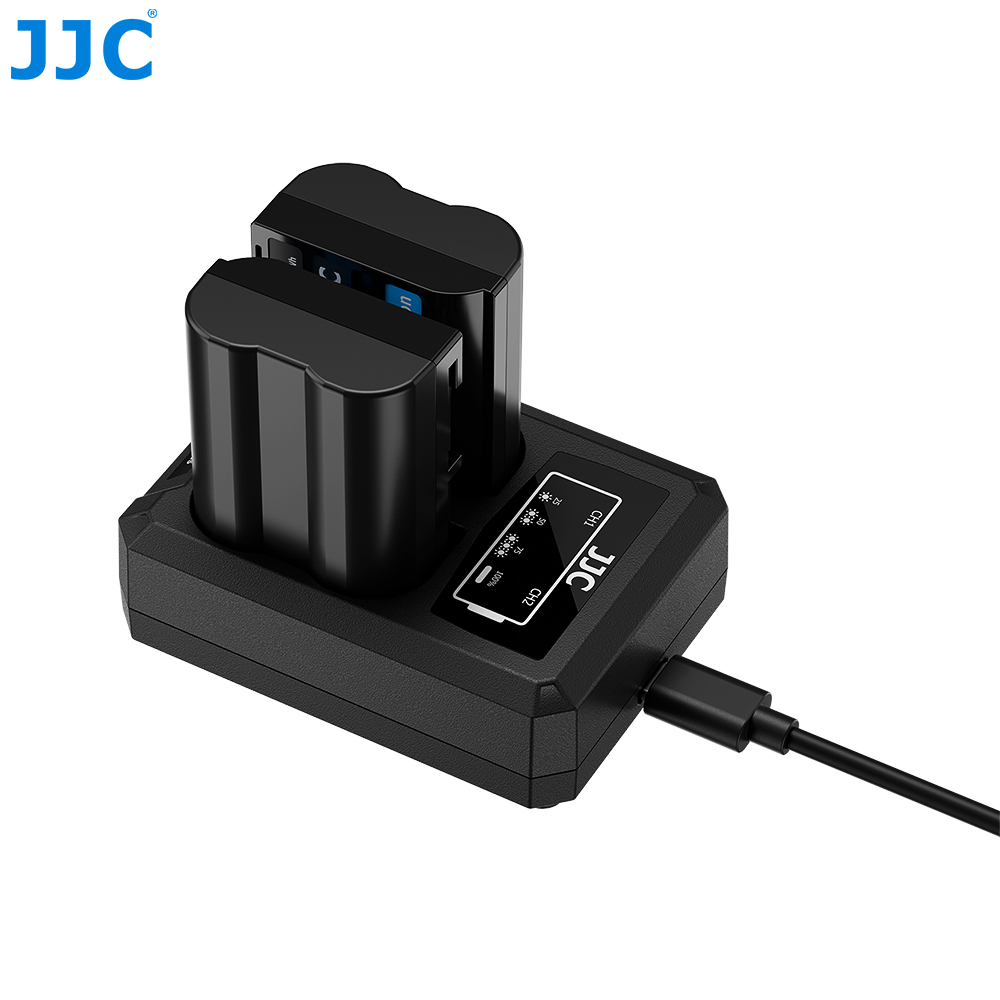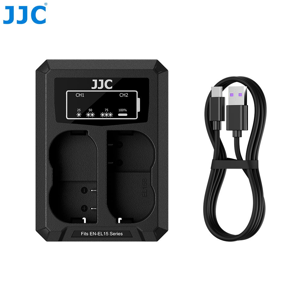 JJC DCH TC series USB Dual Battery Charger allows you to charge 2 batteries at the same time.This battery charger features a universal Type-C (USB-C) port with enhanced compatibility, allowing connection to various power sources. You can charge the device using an AC adapter, laptop, power bank, or car charger, ensuring convenient power supply anytime, anywhere. The charger is equipped with two indicator lights to show the charging status of each slot: flashing while charging and steady on when fully charged. With an overcharge protection design, the charger automatically stops charging once the batteries are fully charged, preventing damage. In addition, a Type-C to USB-A charging cable is included for powering the charger.