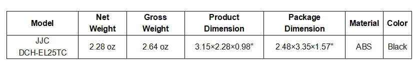Model Fits Specification DCH-EL25TC NIK. EN-EL25 JJC B-ENEL25TC / B-ENEL25 Input:DC 5V⎓2.2A (Min) Output:DC 8.4V±0.15V⎓600mA±50mA Dimension:80 x 58 x 25mm Material:ABS