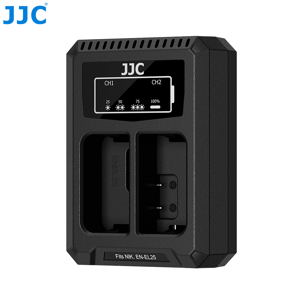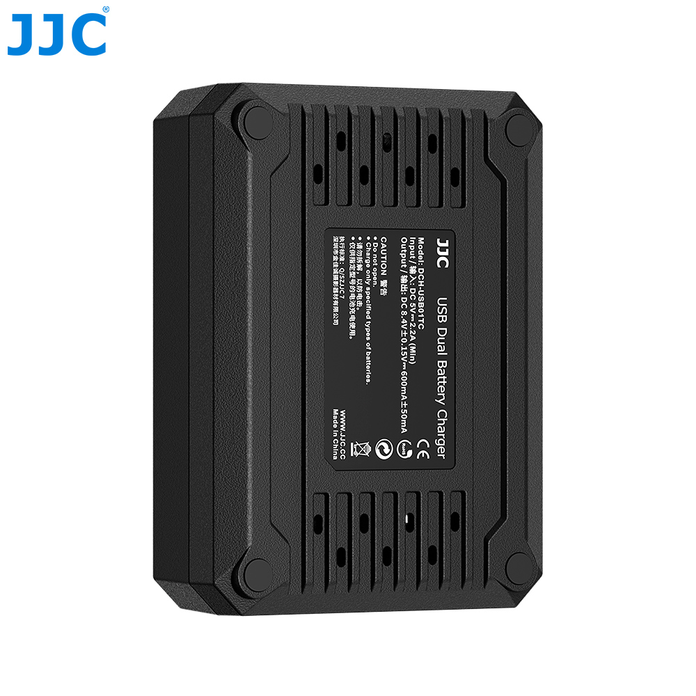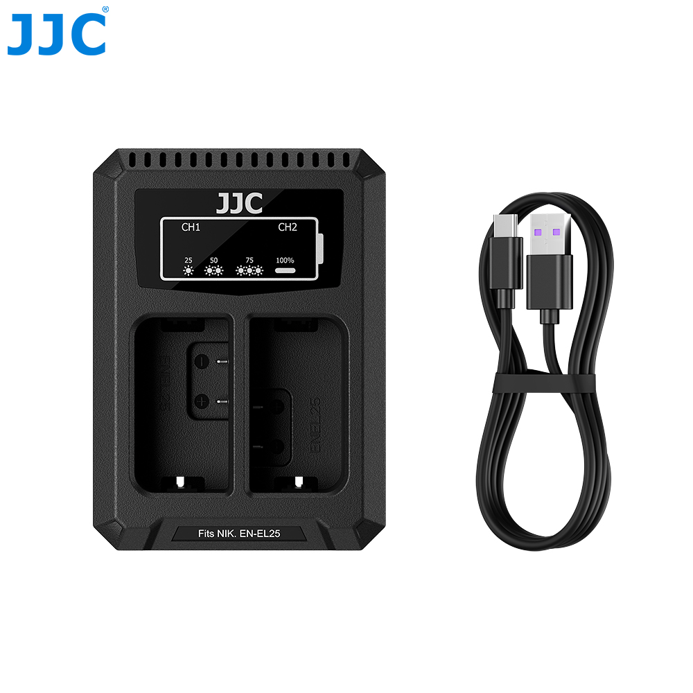 JJC DCH TC series USB Dual Battery Charger allows you to charge 2 batteries at the same time.This battery charger features a universal Type-C (USB-C) port with enhanced compatibility, allowing connection to various power sources. You can charge the device using an AC adapter, laptop, power bank, or car charger, ensuring convenient power supply anytime, anywhere. The charger is equipped with two indicator lights to show the charging status of each slot: flashing while charging and steady on when fully charged. With an overcharge protection design, the charger automatically stops charging once the batteries are fully charged, preventing damage. In addition, a Type-C to USB-A charging cable is included for powering the charger.