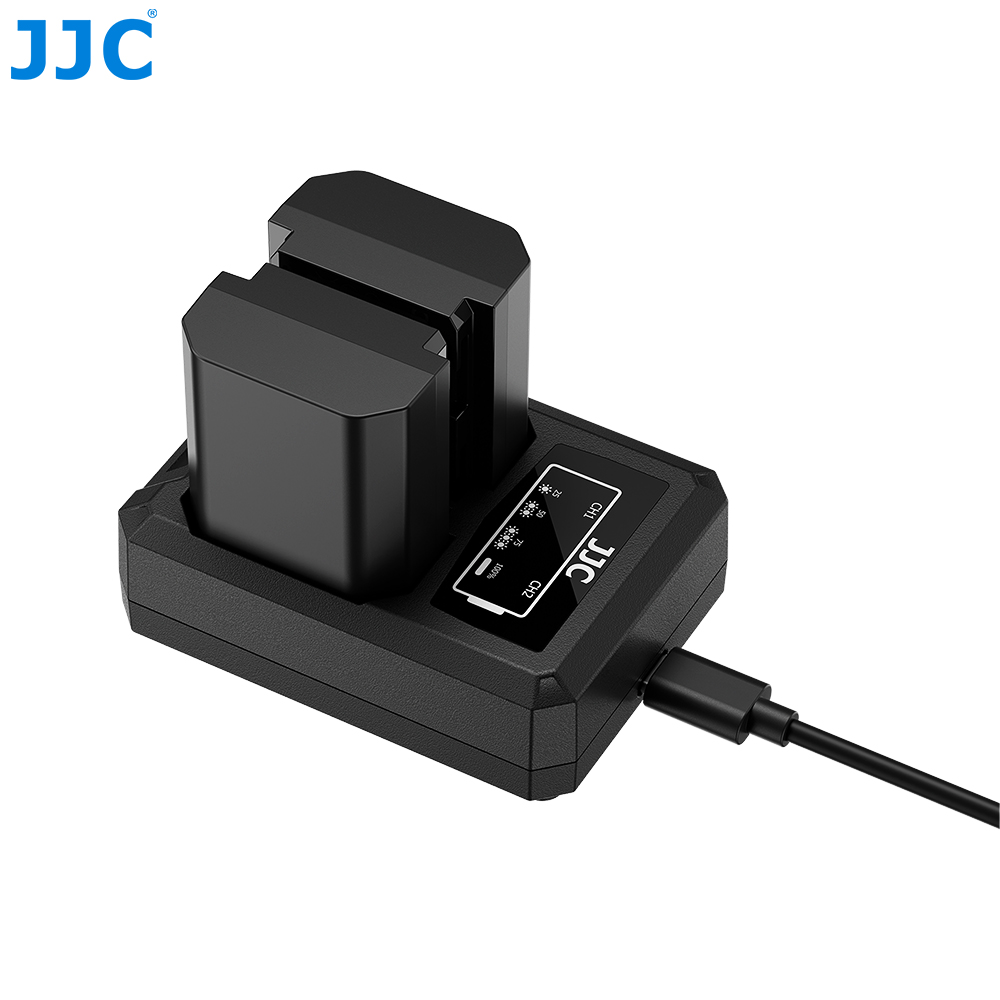 JJC DCH TC series USB Dual Battery Charger allows you to charge 2 batteries at the same time.This battery charger features a universal Type-C (USB-C) port with enhanced compatibility, allowing connection to various power sources. You can charge the device using an AC adapter, laptop, power bank, or car charger, ensuring convenient power supply anytime, anywhere. The charger is equipped with two indicator lights to show the charging status of each slot: flashing while charging and steady on when fully charged. With an overcharge protection design, the charger automatically stops charging once the batteries are fully charged, preventing damage. In addition, a Type-C to USB-A charging cable is included for powering the charger.