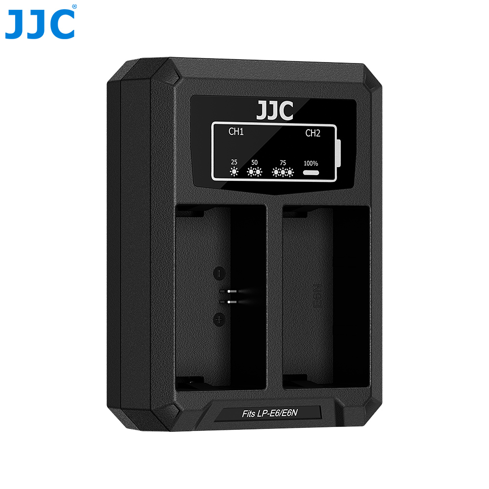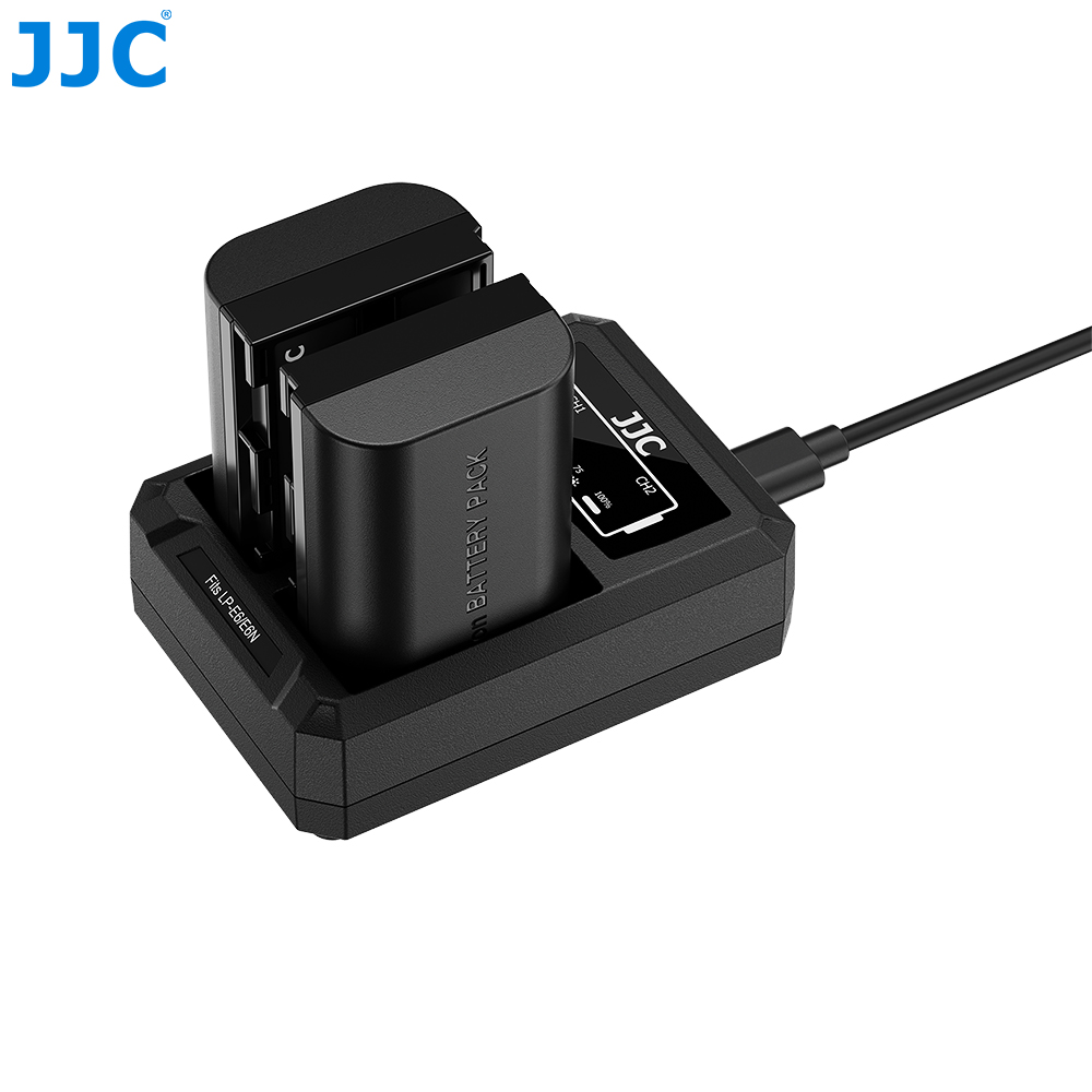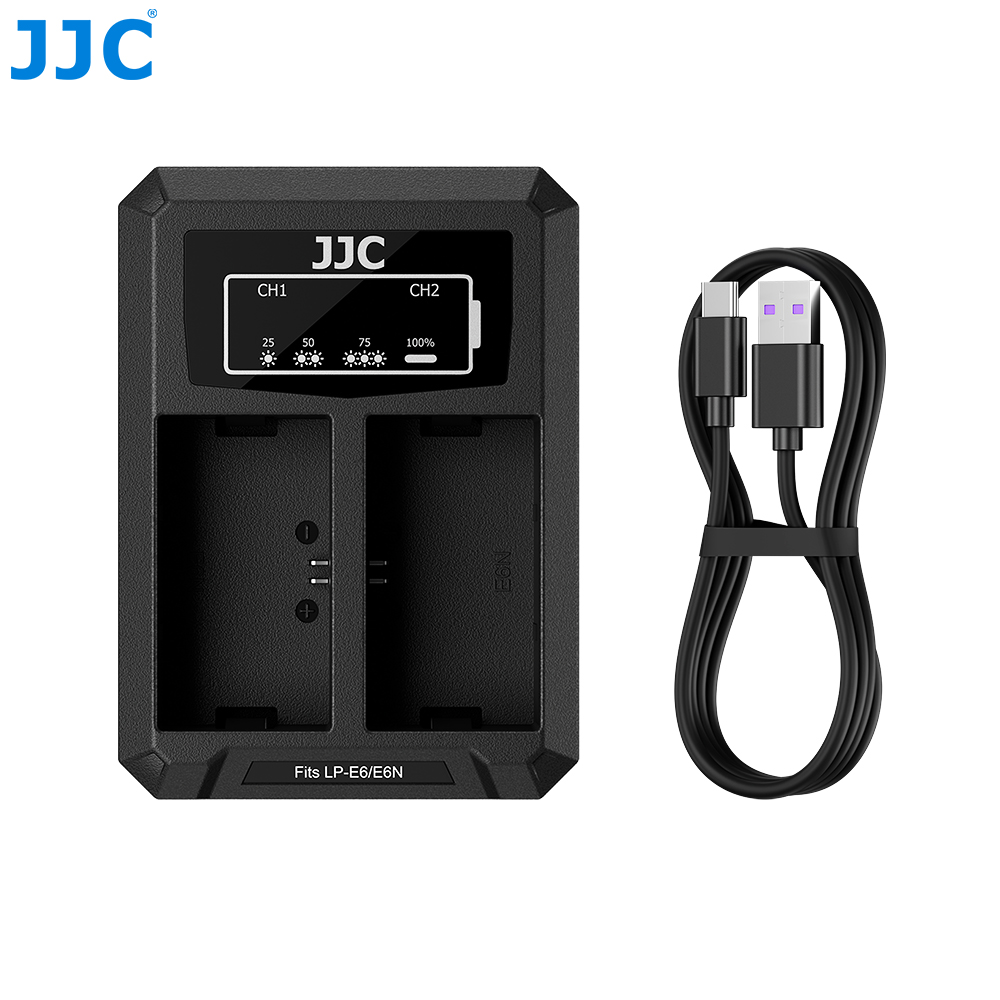 JJC DCH TC series USB Dual Battery Charger allows you to charge 2 batteries at the same time.This battery charger features a universal Type-C (USB-C) port with enhanced compatibility, allowing connection to various power sources. You can charge the device using an AC adapter, laptop, power bank, or car charger, ensuring convenient power supply anytime, anywhere. The charger is equipped with two indicator lights to show the charging status of each slot: flashing while charging and steady on when fully charged. With an overcharge protection design, the charger automatically stops charging once the batteries are fully charged, preventing damage. In addition, a Type-C to USB-A charging cable is included for powering the charger.