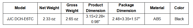 CAN. LP-E6/LP-E6N JJC B-LPE6 | Input:DC 5V⎓2.2A (Min) Output:DC 8.4V⎓600mA Dimension:80 x 58 x 25mm Material:ABS |