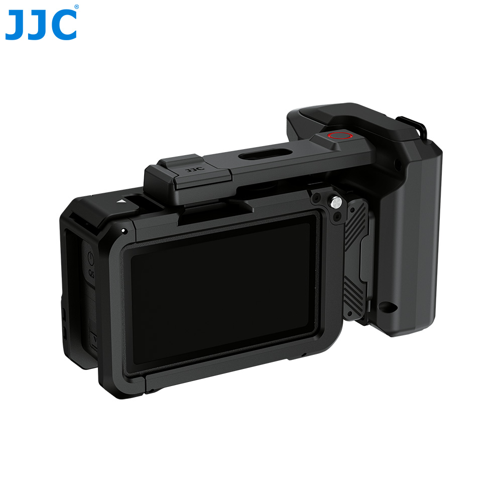 For DJ. Osmo Action 5 Pro / 4 / 3;Lightweight and durable aluminum alloy cage with precise fit;Soft anti-slip silicone pads to prevent scratches;Can Store one battery and one microSD card;Lanyard hole compatible with JJC wrist strap (sold separately);ABS and silicone handle with ergonomic design, lightweight and comfortable;Cold shoe mount on the lever for accessory expansion;Shutter adapter button for smoother shooting control;Adjustable shutter adapter button contact point for different models;No interference with buttons, touchscreen, or ports;Battery door and microSD slot remain fully accessible;Daily operation without frequent disassembly;Includes lens cap, hot-shoe cover, anti-loss cord, and wrist straps