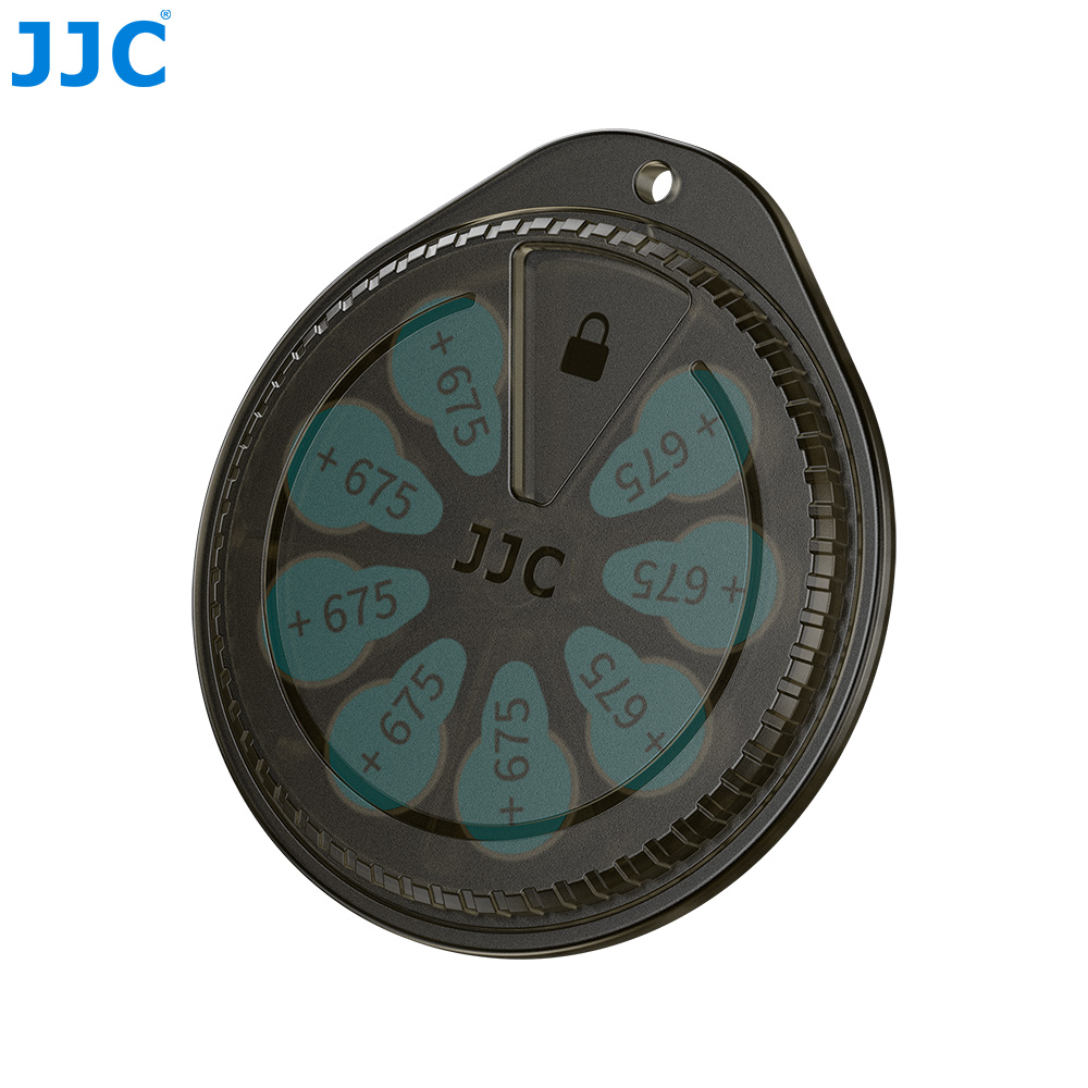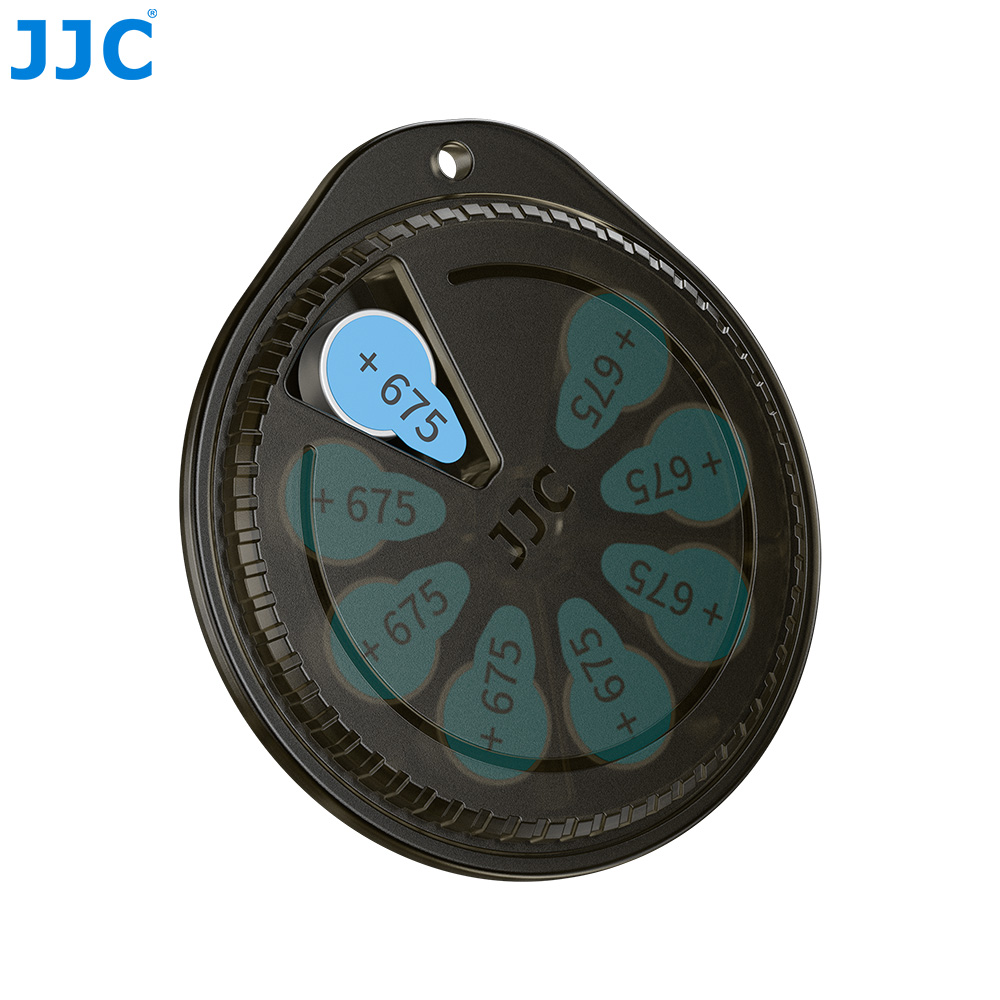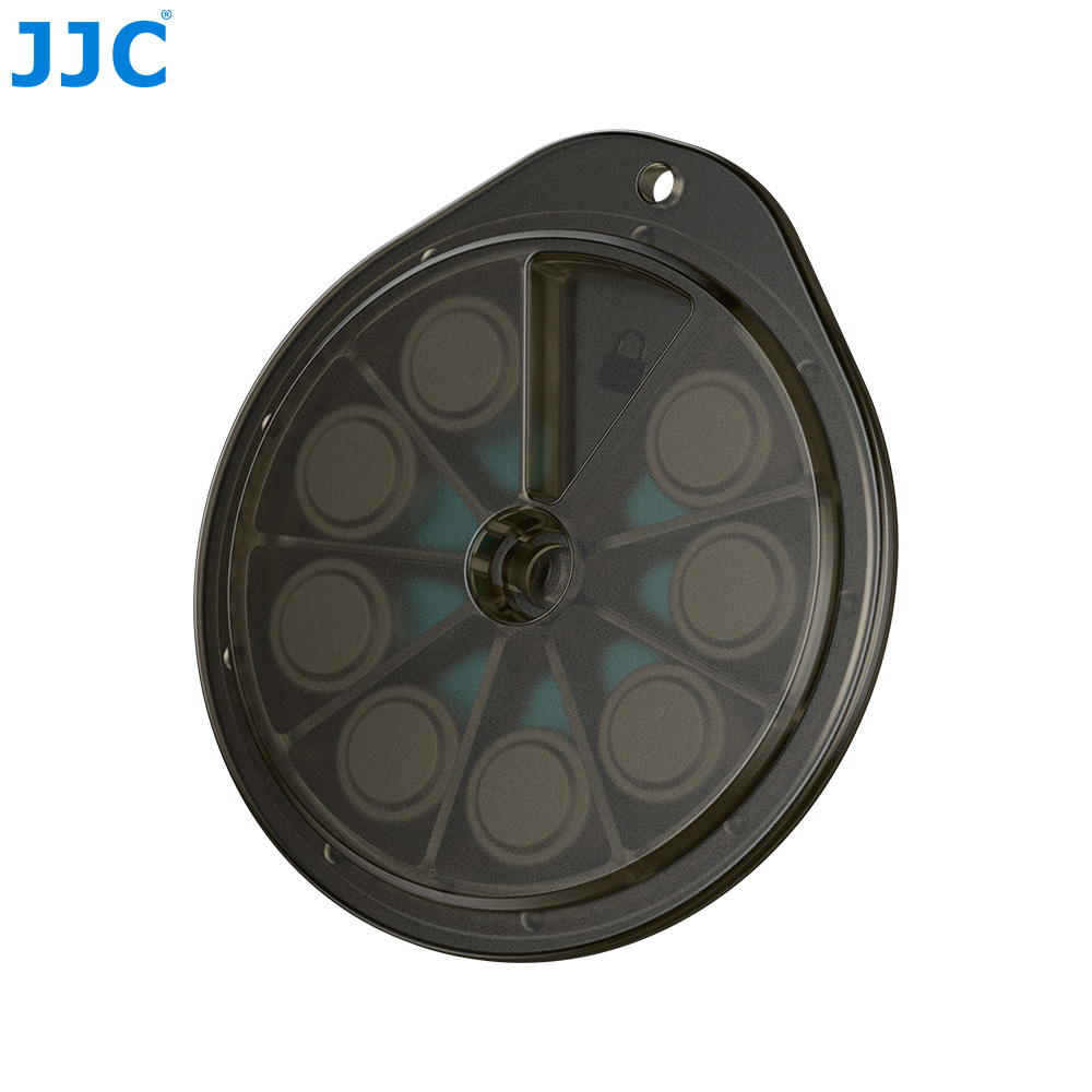 JJC BW-675X8 Battery Storage Box can hold up to 8 button batteries (Φ ≤ 12 mm, H ≤ 5.5 mm). Featuring a “rotary dispensing” design, the top cover can be rotated to a specific position to open the corresponding slot, allowing users to take out the target battery precisely and in one direction, adding both a sense of ritual and fun to the operation. Slots that are not aligned remain sealed, effectively isolating the batteries from dust and moisture in the air and helping extend battery lifespan. The independent slot structure keeps batteries neatly organized and easy to retrieve, while preventing short circuits or surface abrasion caused by batteries contacting one another. The outer shell is made of premium PC material, offering durability and reliability. With its compact size, the case is easy to carry. In addition, the product includes a keychain for convenient portability and to reduce the risk of loss.